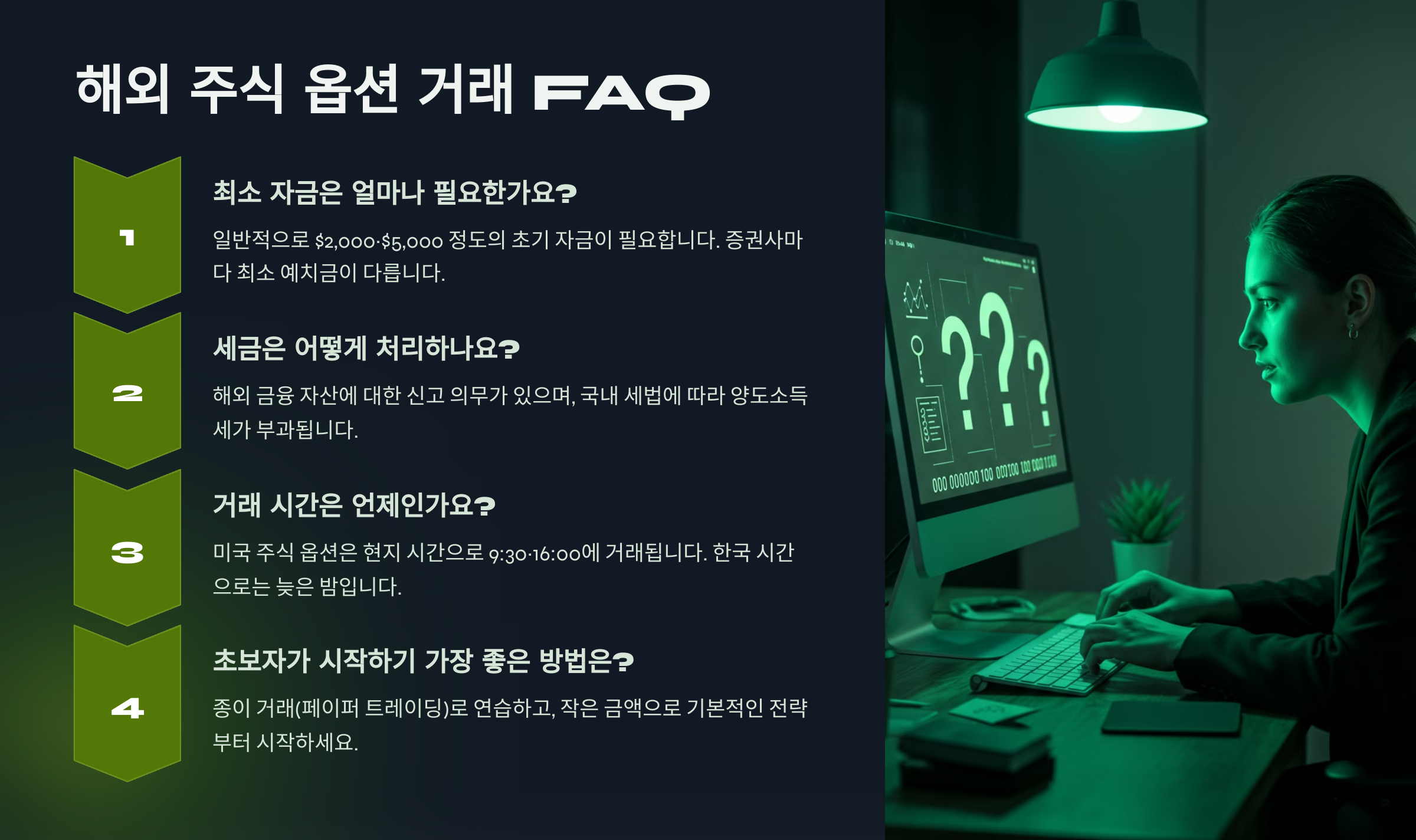 A7. 네, 국내 증권사(미래에셋, NH투자증권 등)에서도 해외 옵션 거래를 지원하지만, 종목이 제한적이에요. 더 다양한 옵션 전략을 사용하려면 IBKR, TD 아메리트레이드 같은 해외 증권사를 이용하는 것이 좋아요.