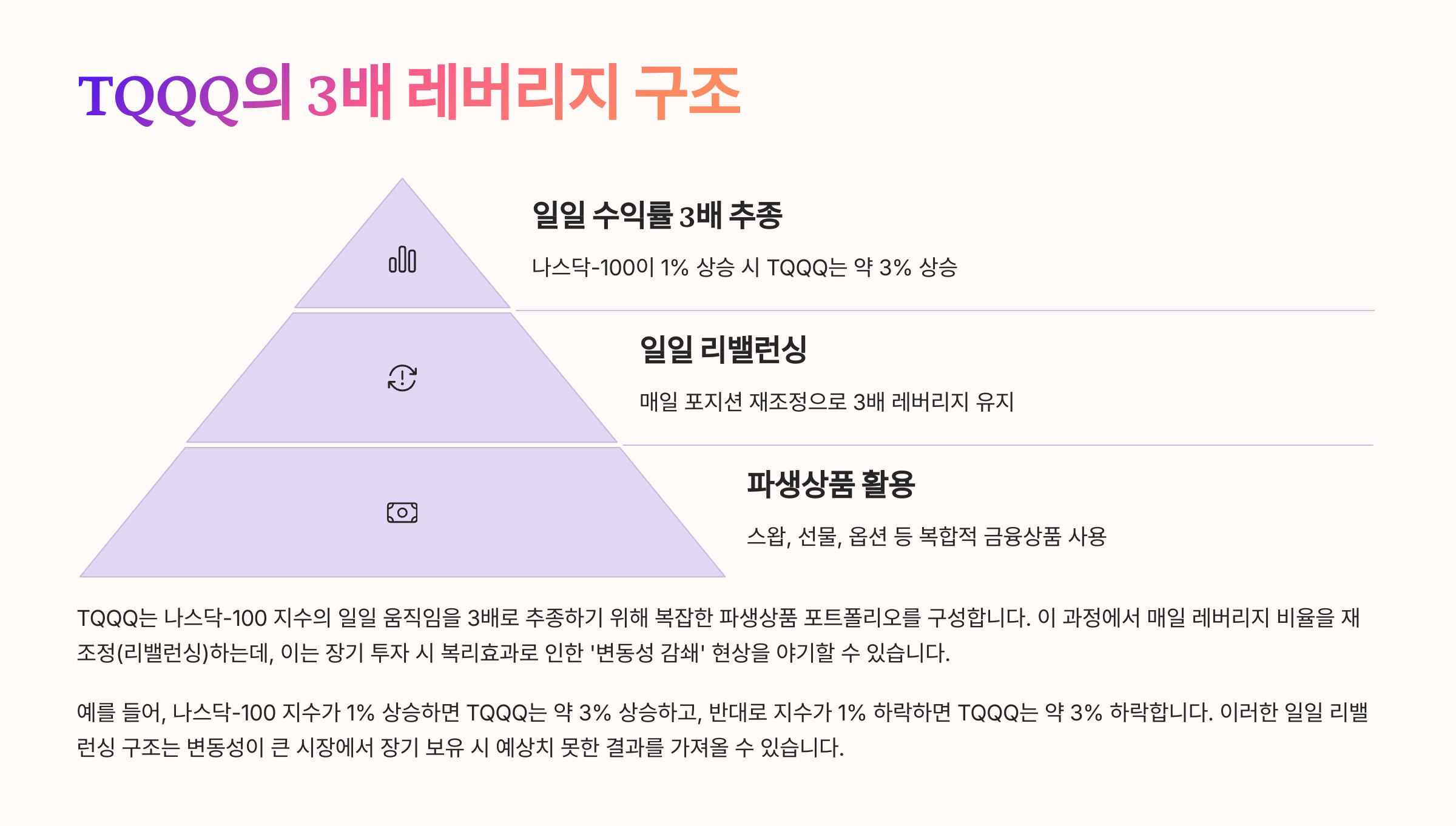 TQQQ는 선물, 옵션, 스왑계약 등 파생상품을 활용해 3배 레버리지를 구현하고 있어요. 그래서 이자 비용, 유동성 비용, 일일 리밸런싱 비용이 ETF 내부에서 계속 발생해요. 이 비용은 장기 수익률을 갉아먹는 요소로 작용할 수 있어요.