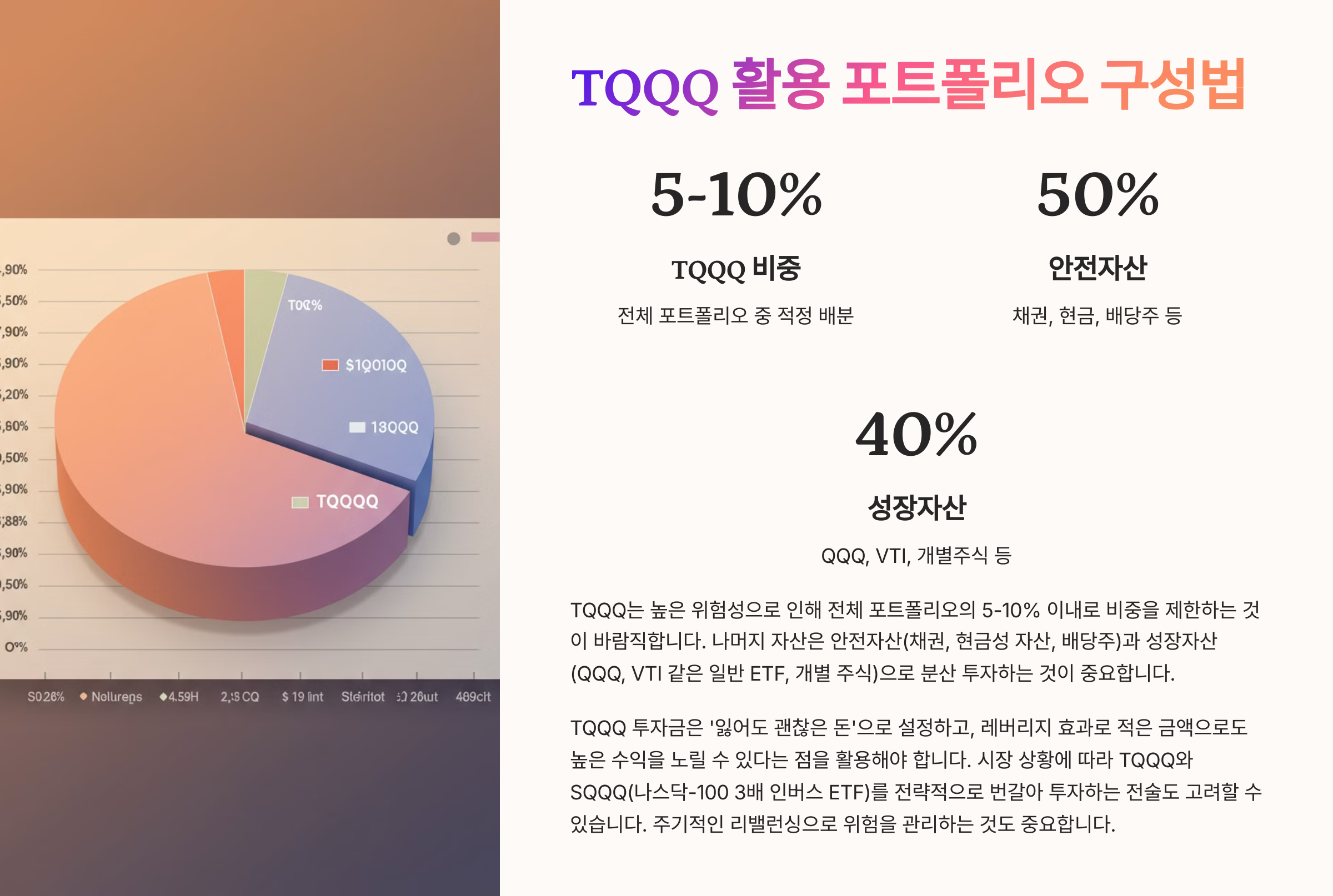 TQQQ는 고위험 고수익 상품이라 단독으로 포트를 구성하기보다는 다른 ETF들과 조합해 '위험 조절형 전략'으로 편입하는 게 좋아요. 일반적으로는 QQQ, SPY, 채권 ETF 같은 안정적인 자산과 섞어 변동성을 낮추는 방식이 많이 쓰여요.