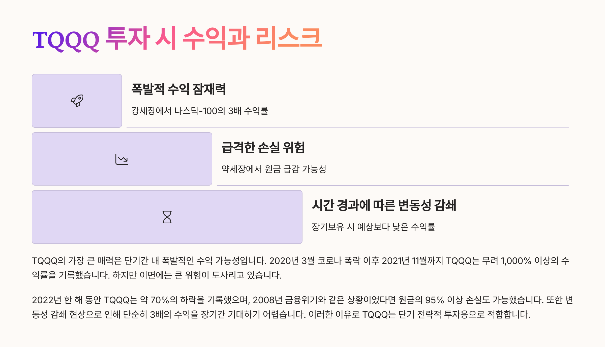 예를 들어, 나스닥이 하루는 +2%, 다음날 -2%라면 전체 지수는 거의 제자리인데, TQQQ는 -1.2% 손실을 보게 돼요. 이처럼 변동성이 클수록 장기 보유 시 누적 수익률이 오히려 낮아질 수 있다는 걸 기억해야 해요.