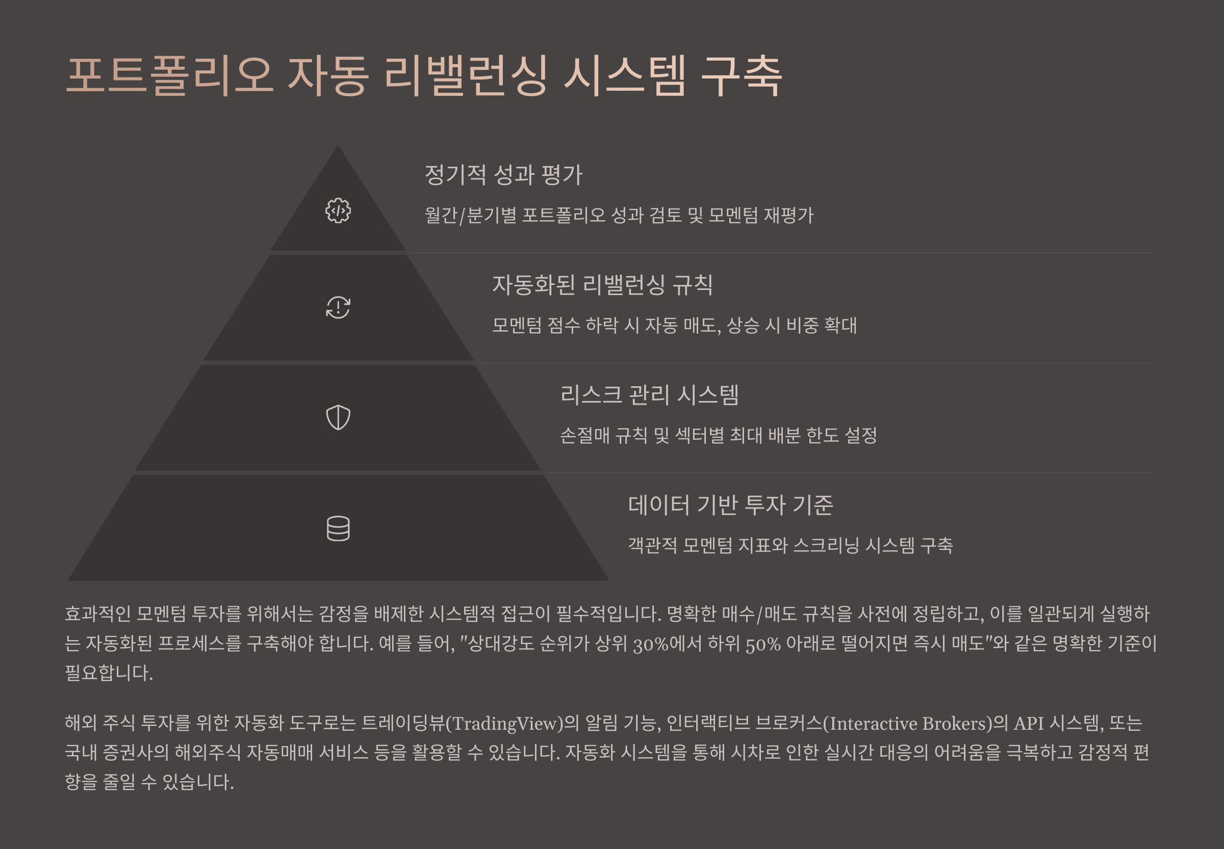 모멘텀 투자는 빠른 추세 전환에 대응해야 하기 때문에 정기적인 리밸런싱이 정말 중요해요. 종목이나 섹터의 흐름이 바뀌면, 그에 맞게 포트폴리오도 유연하게 바뀌어야 수익률을 유지할 수 있거든요. 그래서 자동화된 리밸런싱 시스템이 큰 도움이 돼요.
