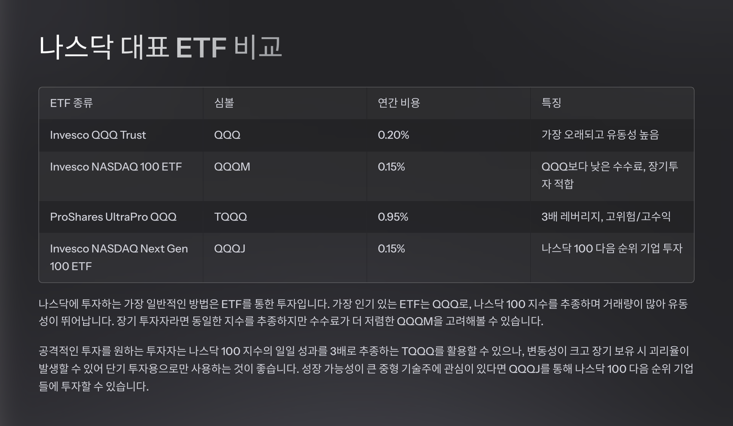 ETF를 잘 활용하면, 나스닥 투자도 안정적이고 체계적인 포트폴리오 안에 포함시킬 수 있어요. 다음 섹션에서는 나스닥 대표 ETF: QQQ, QQQM, TQQQ 차이를 자세히 비교해볼게요! 📊
