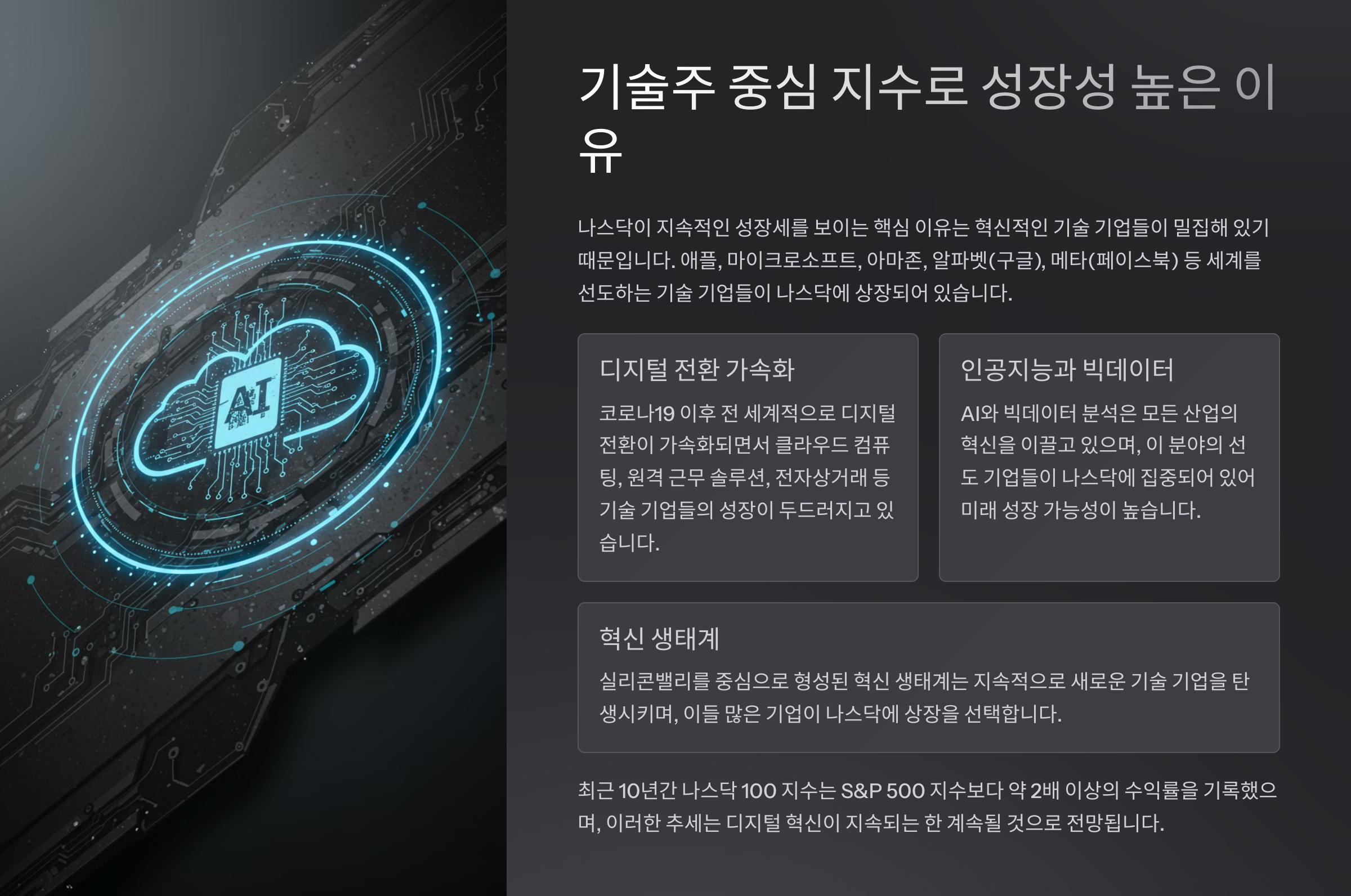 나스닥은 기술 혁신과 미래 성장 가능성을 가장 잘 반영하는 지수예요. 변동성은 있지만 그만큼 장기적으로 높은 수익을 기대할 수 있다는 게 매력이죠. 이제 다음 섹션에서는 나스닥이 왜 성장성이 높은지, 기술주 중심 지수의 이유를 설명드릴게요! 💡