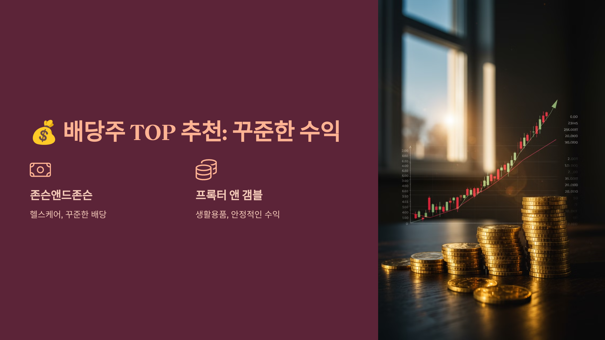 배당주를 선택할 때는 연속적으로 배당을 지급해온 기업인지, 배당 수익률이 안정적인지 확인하는 것이 중요해요. 대표적인 배당주로는 코카콜라(KO), 존슨앤드존슨(JNJ), 프록터앤드갬블(PG) 등이 있어요.