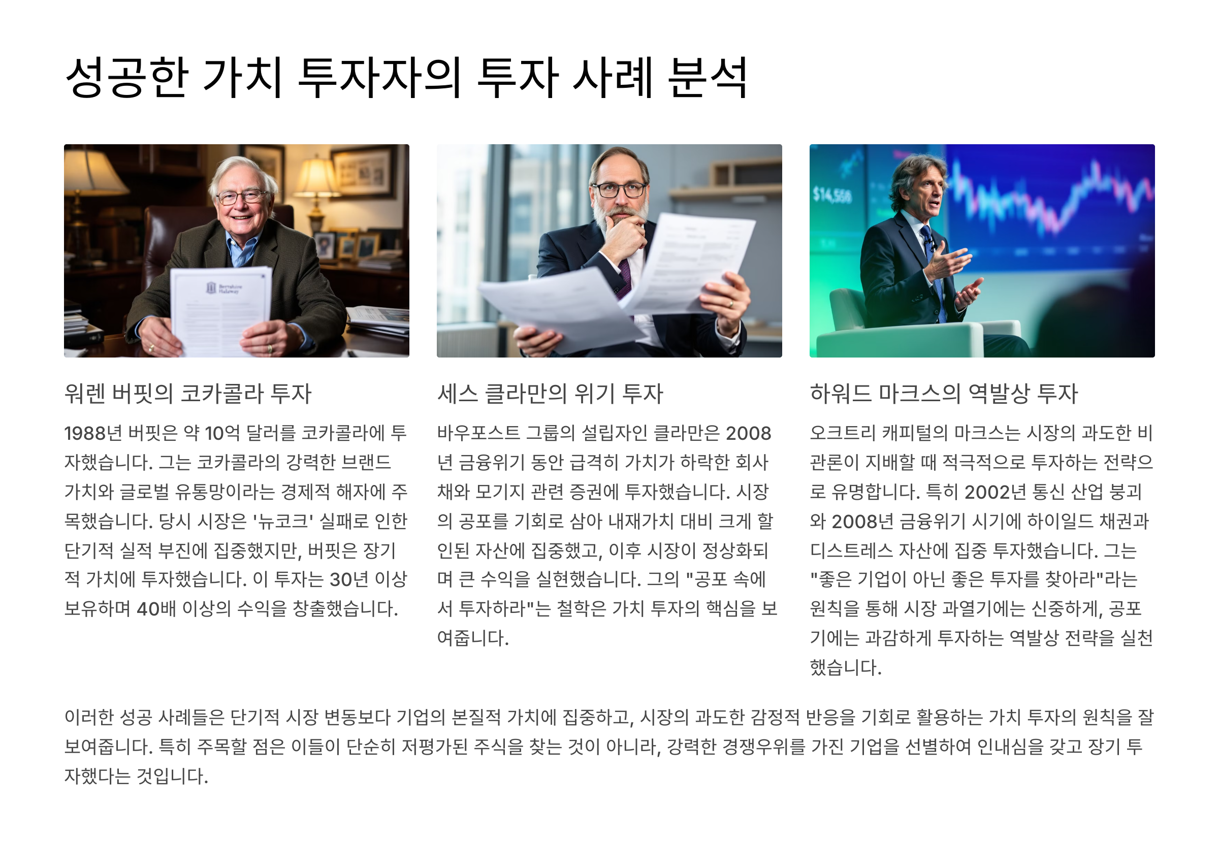 이처럼 성공한 투자자들은 각각의 방식으로 가치 투자를 실천했어요. **장기적인 관점에서 기업의 가치를 분석하고, 안전마진을 확보하는 것이 핵심**이라는 점을 알 수 있어요.