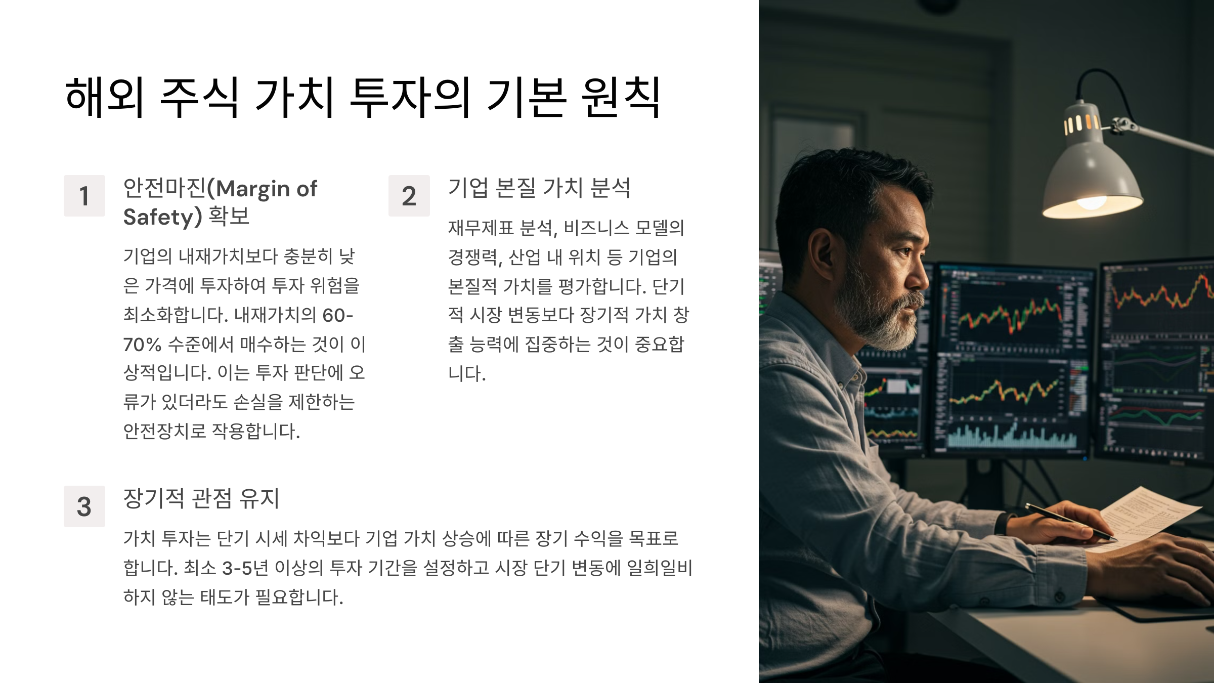 가치 투자는 단순히 싼 주식을 사는 것이 아니라, 기업의 본질적인 가치를 파악하고 그보다 낮은 가격에 매수하는 전략이에요. 기본적인 원칙은 다음과 같아요.