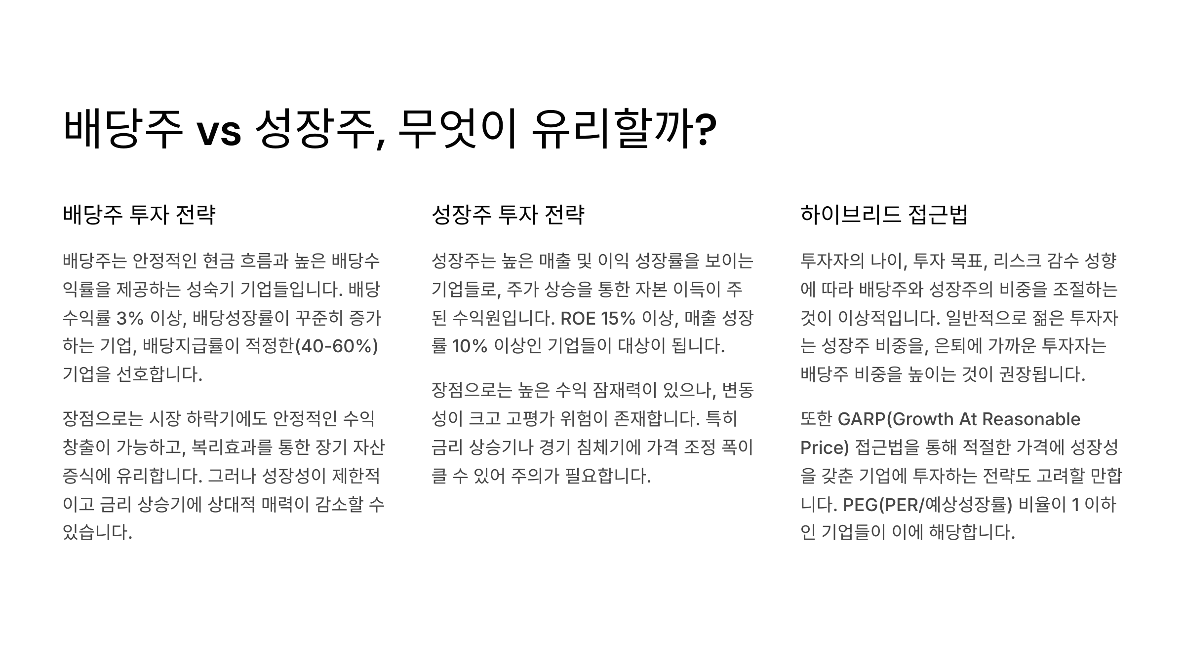 배당주와 성장주는 각각 장점이 있어요. **안정적인 현금 흐름이 중요하다면 배당주**, 높은 수익을 노린다면 **성장주**가 더 적합해요.
