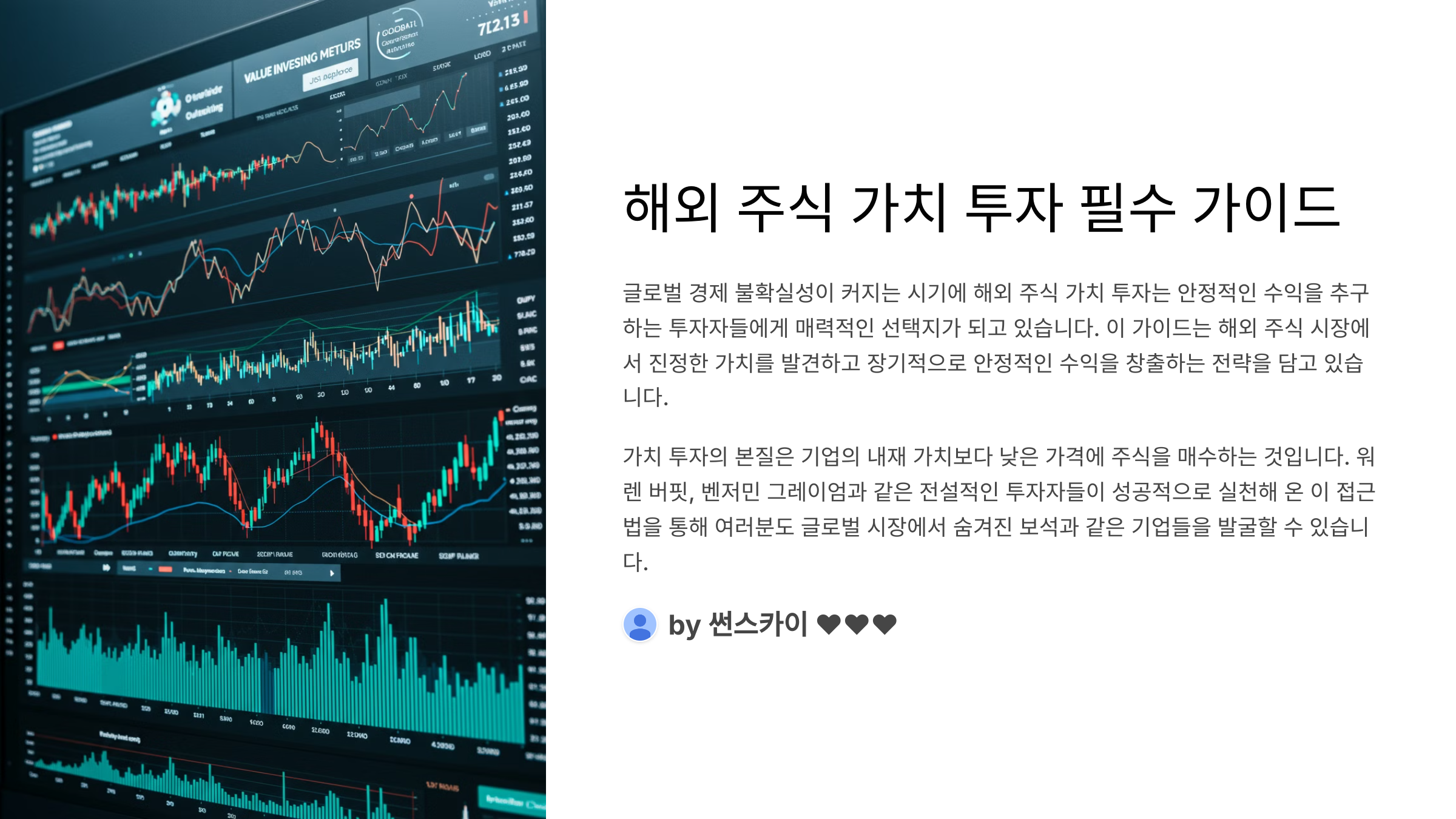 해외 주식 투자에 관심이 있다면, 가치 투자(Value Investing)에 대한 개념을 확실히 알아두는 게 좋아요. 가치 투자는 단기적인 시장 변동에 휘둘리지 않고, 기업의 내재 가치를 분석해 저평가된 주식을 매수하는 전략이에요.