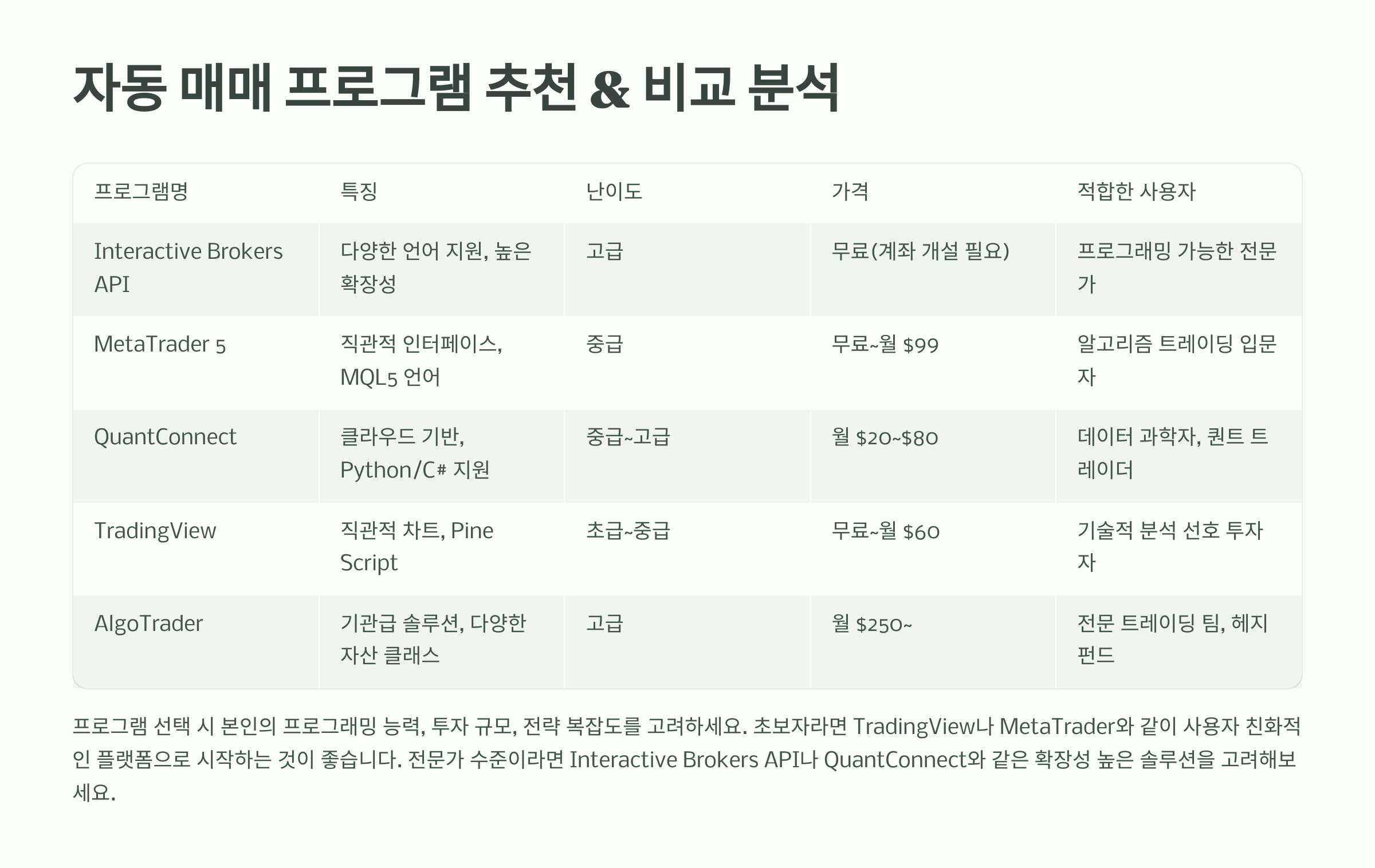 자동 매매를 구현하려면 적절한 프로그램을 선택해야 해요. 프로그래밍이 필요 없는 간단한 봇부터, 전문적인 퀀트 투자 플랫폼까지 다양한 옵션이 있어요. 🤖