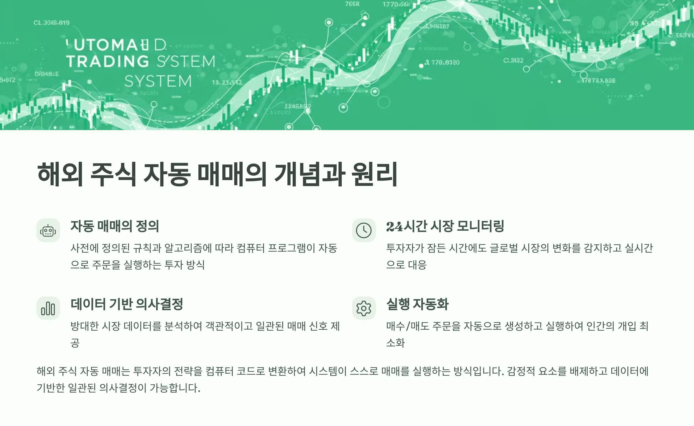 해외 주식 시장은 24시간 움직이며, 시차 때문에 직접 거래하기 어려운 경우가 많아요. 이런 문제를 해결하는 방법 중 하나가 자동 매매(Algorithmic Trading)예요. 🤖