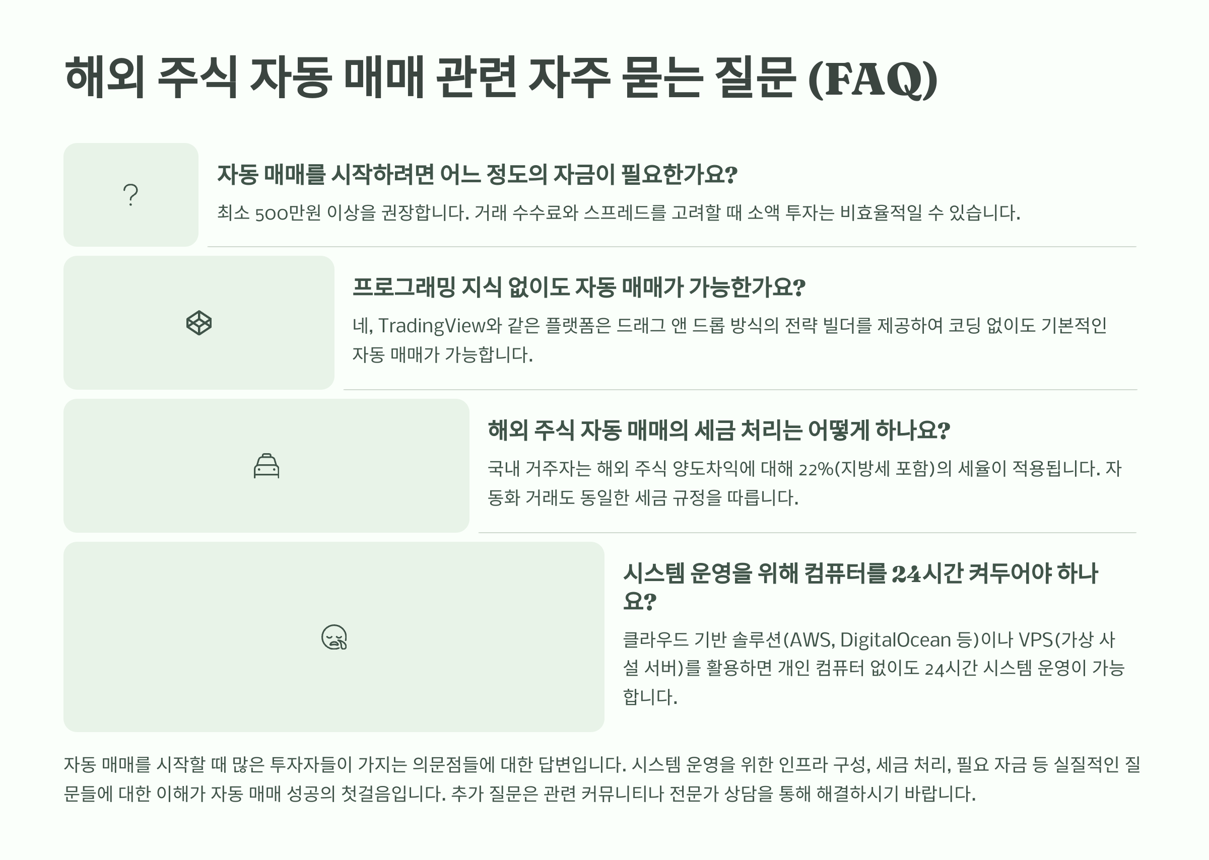 해외 주식 자동 매매를 시작하려는 분들이 가장 궁금해하는 질문들을 정리해 봤어요! ❓