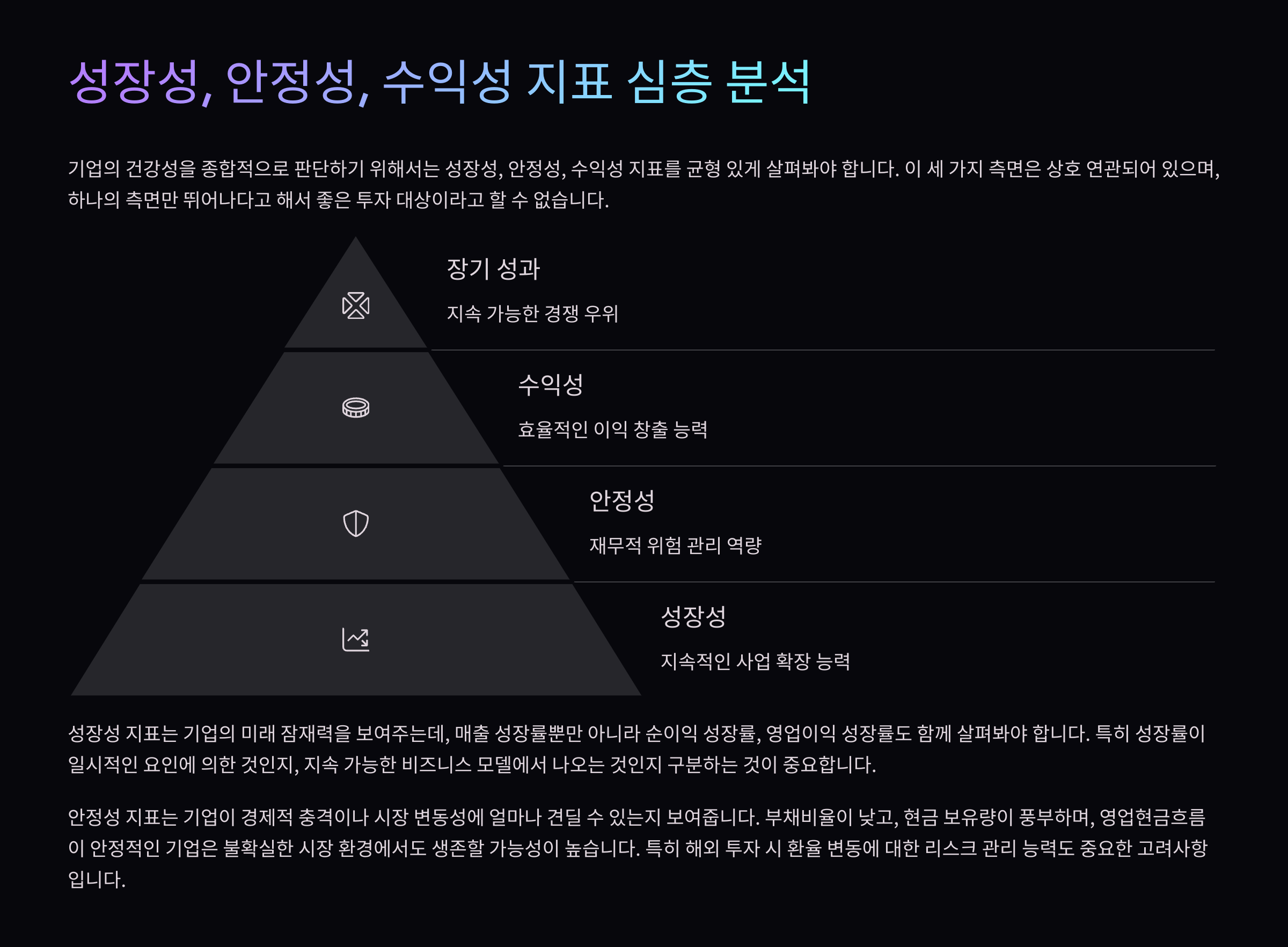 PER, PBR, ROE처럼 많이 쓰이는 지표 외에도 기업을 깊이 있게 분석하려면 성장성, 안정성, 수익성까지 종합적으로 살펴야 해요. 이 세 가지는 기업의 '지금'과 '미래', 그리고 '위험'을 한눈에 보여주는 핵심 축이에요.