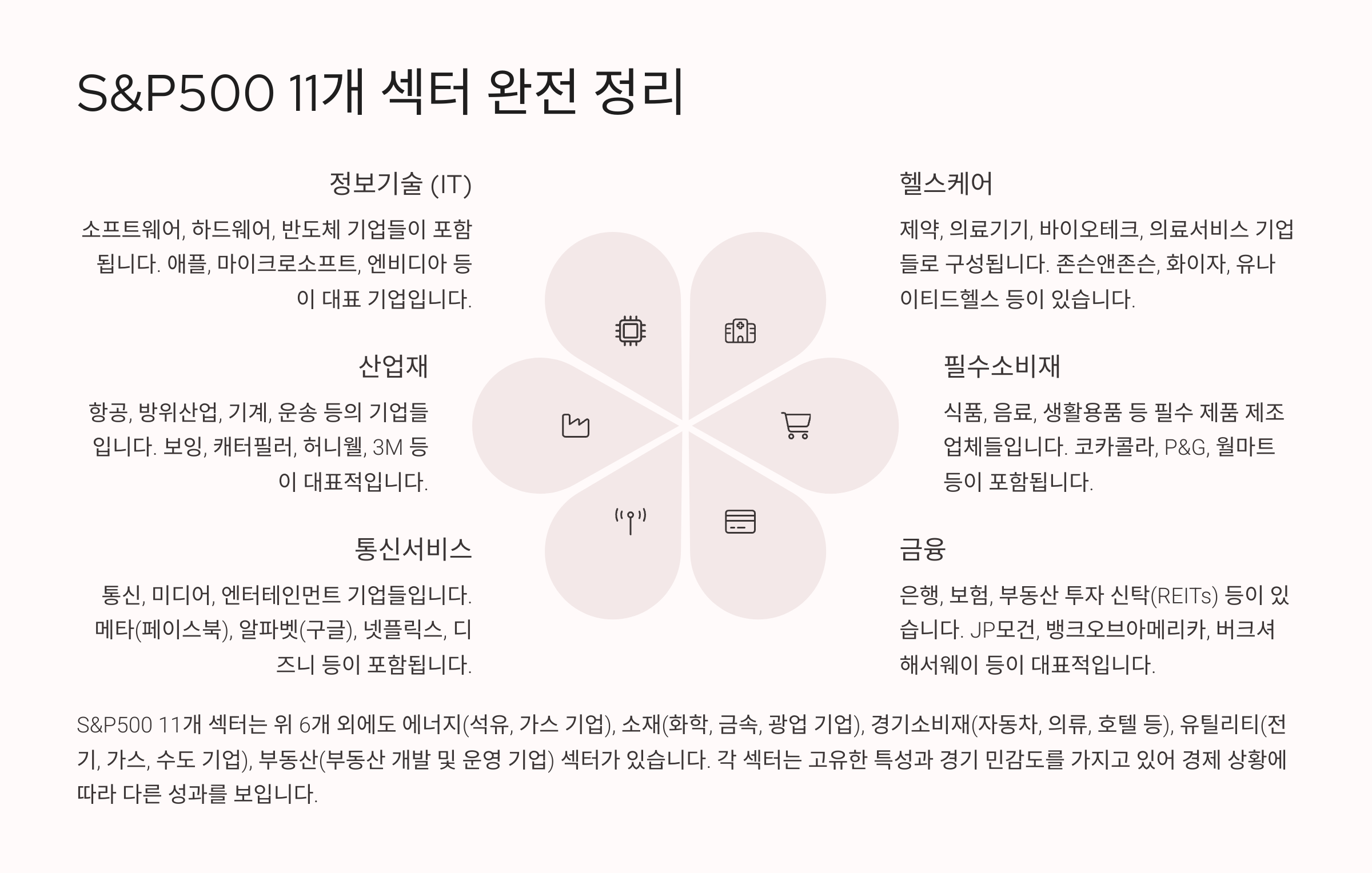 섹터 흐름은 단순히 '좋아 보이는 기업'을 넘어서 시장 전체의 방향을 읽을 수 있는 중요한 힌트예요. 다음 섹션에서는 미국 S&P500 기준으로 산업이 어떻게 나뉘는지, 11개 섹터를 전부 소개해드릴게요! 🧩