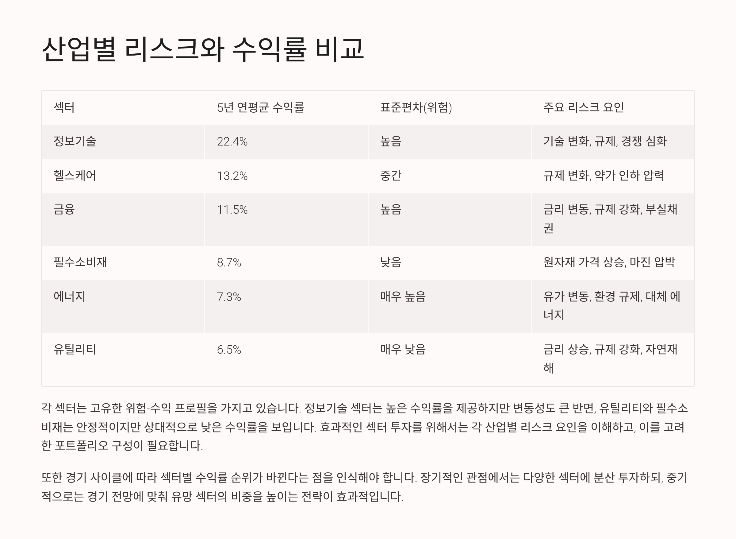 ETF만 잘 골라도 섹터 투자 전략은 반쯤 완성된 거예요! 시장 상황에 맞게 성장/방어 섹터 비중 조절만 잘 해도 꾸준히 수익을 낼 수 있어요. 다음 섹션에서는 섹터별 리스크와 수익률 차이를 정리해볼게요! 💡