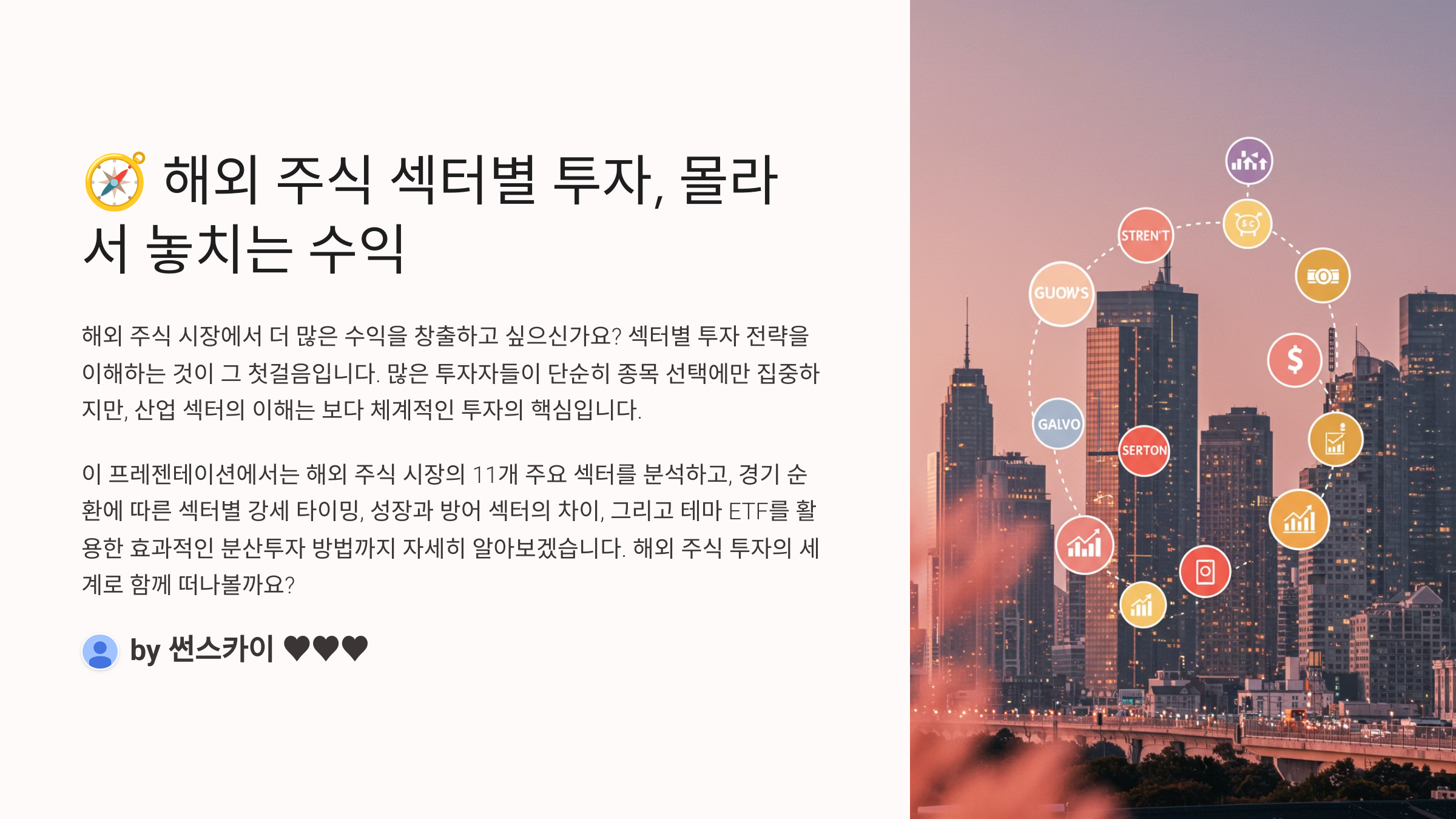 해외 주식 투자를 시작했는데, 매번 어떤 종목을 사야 할지 고민되신다면 ‘섹터 투자’ 전략이 정답일 수 있어요. 시장 전체를 보며 각 산업군의 흐름에 맞춰 투자하면, 특정 기업이 아닌 큰 방향성에 올라탈 수 있거든요.