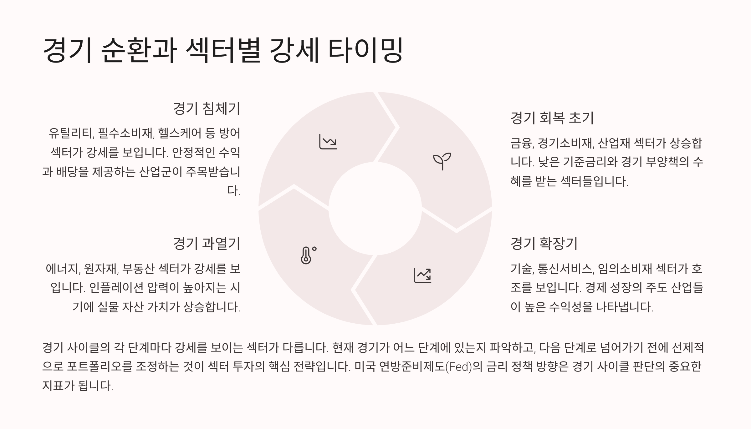 경기 사이클은 일반적으로 회복기 → 확장기 → 둔화기 → 침체기의 네 단계로 나뉘어요. 그리고 이 흐름에 따라 강세 섹터도 바뀌어요. 예를 들어 회복기에는 기술주와 경기민감주가, 침체기에는 필수소비재나 헬스케어가 주목받아요.
