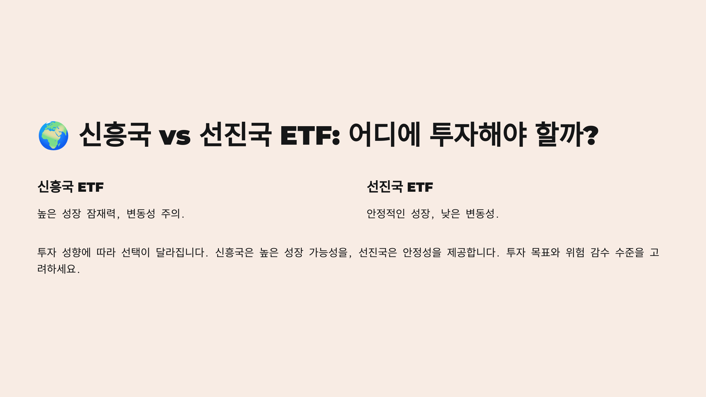 2025년, ETF 투자를 고민하는 투자자라면 신흥국 vs 선진국 중 어디에 투자할지 고민될 거예요. 🌍 신흥국 ETF는 빠른 성장 가능성이 있지만 리스크가 크고, 선진국 ETF는 안정적이지만 성장률이 낮을 수 있어요.